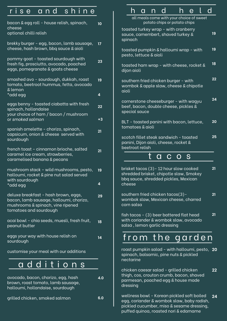 Cafe Cornerstone offers a diverse menu that celebrates the art of cafe cuisine. Start your day with their enticing rise and shine options, like the rich and savory brekky burger, which tantalizes with its combination of egg, bacon, lamb sausage, and a crispy hash brown, all topped off with BBQ sauce and aioli. Or consider the elegant pommy goat on toasted sourdough, featuring fresh figs, prosciutto, and creamy goat cheese, a dish that sings with springtime flavors.